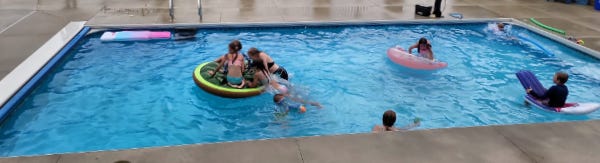 Given that my sister lives next door to my parents, my family and I headed over early to help out. Mom and May were helping by getting the food ready, while Gracie and I jumped into the aforementioned pool to make sure the water was warm, the floatables were, uh, floating, and just to confirm that the pool was prepped well enough so that everything would go… ahem… swimmingly.