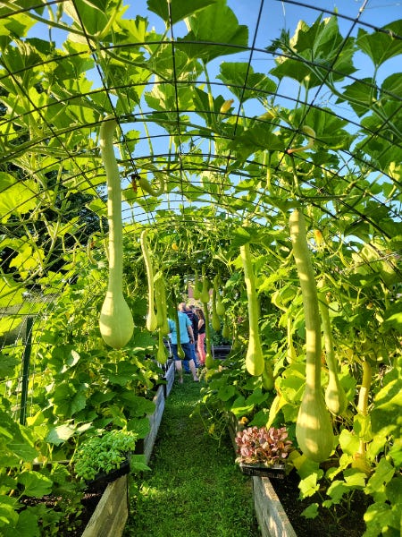 Before the meal, they give a little tour around the “farm” which, to the untrained eye, just looks like a large garden. But, the variety of food that they have there is pretty amazing. They also are able to get by without using pesticides by including plants that attract insects that, in turn, eat the insects that would damage the crops. Sort of like “A Bug’s Life” circle-of-life approach, where the ladybugs are stalking down and pouncing on the aphids, focusing the elderly and infirmed ones,