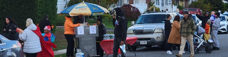 Sure enough, it was a full-blown event. While some people passed out candy from their doorways, most folks were out in their driveways, in costume, themselves, handing out treats to the kids. Some were grilling food. Others had Halloween music playing. Someone had brought out a hot dog stand. Not to be outdone, down the street there was a food truck, and even some rented event lighting for the middle of the street.