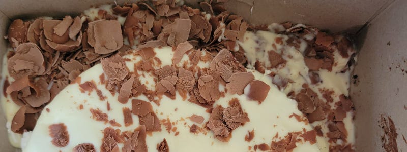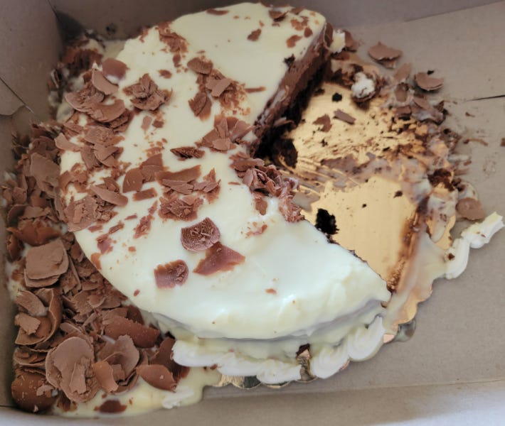 Further investigation revealed that the icing had pooled behind the cake, along with most of the chocolate shavings. I am surmising that the original cake was supposed to have a nice, solid, opaque white chocolate coating covered with the chocolate shavings, not the compost-leaf-pile motif visualized here.